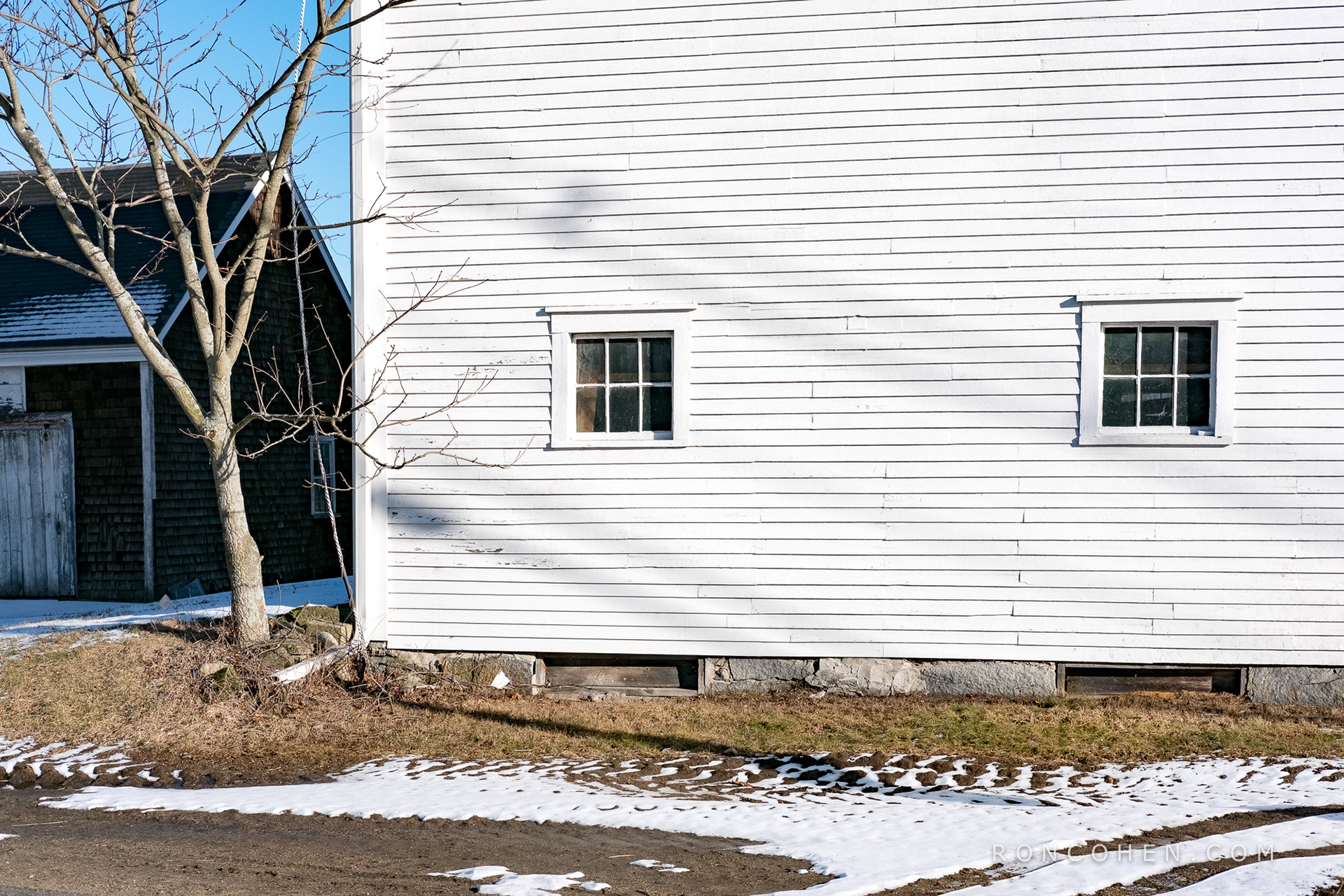 The low, bright, afternoon sun set the white buildings aglow. I had to stop and take some pictures. These simple, white, wooden structures reflect the rationalist sensibility of 18th Century New England, a way of seeing that continued into the early 19th Century, when most of them were probably built.
