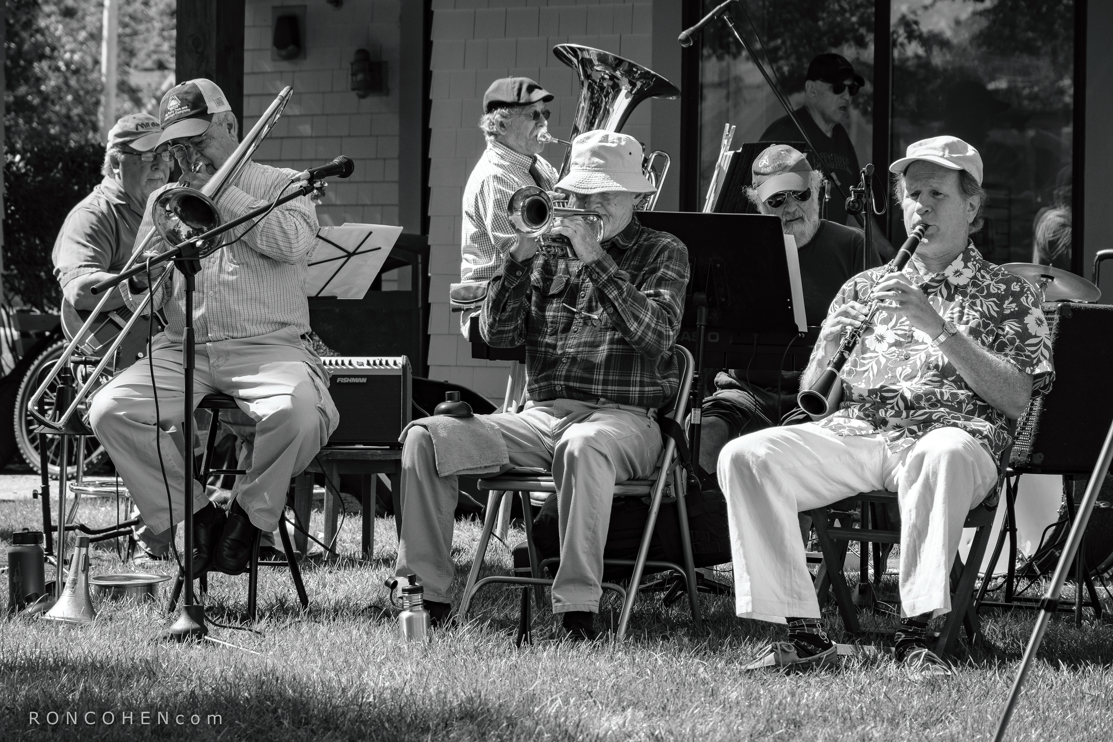 After a coffee and muffin at the Twisted Tree Café, my companion and I walked next door to the Lincoln Arts & Farmers Market. There, we ensconced ourselves comfortably in big, wooden lawn chairs, and enjoyed the sounds of the Lincoln Traditional Jazz Band. Before leaving the café, I had taken two photos of patrons. At the market, I shot several more of the jazz band, and of a lovely Shetland Sheepdog, or "Sheltie." All of which I've posted here. It was a beautiful day, a Saturday, and we enjoyed ourselves immensely.